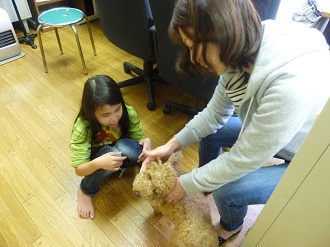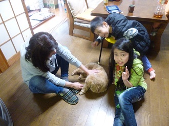 朝から玄関のチャイム誰だろう〜って思ったらプー助ちゃん 長女から子守を頼まれていたのを忘れてた! 春休み、帰省中の次女家族 始め、怖がっていた子供達も 触りたくてしょうがない! 人間も動物もしつけ次第 帰る頃には犬が欲しいって言われそう(汗) いつもゲームばかりしてるのに・・・ 動く動物の方が面白いみたい! 2015年3月28日