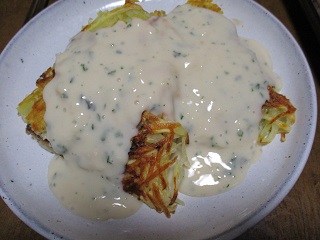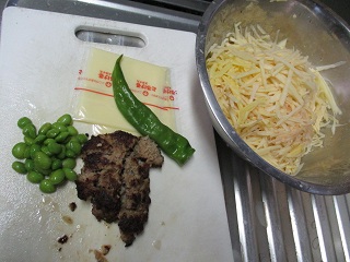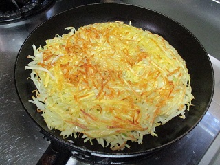 叔母にダンボール半分のじゃが芋を貰ったのに 納戸に置いたまま、すっかり忘れてた 慌てて開けたら5,6個腐ってる(´Д`) 叔母の自慢のじゃが芋 腐らせる前に食べないと申し訳が無い 娘に教えてもらった、初めての料理 ガレット 聞こえは良いけど 洋風お好み焼きみたい(゚Д゚) 残り ハンバーグを使います 材料 ハンバーグ 枝豆 甘長ピーマン(輪切り) チーズ ホワイトソース ドライバジル 砂糖(小スプン1) 先日買ったスライサーで千切りにカット 水にはさらさない(固める役目のため注意) オリーブオイルは多めに・・・ じゃが芋の半分と、他の食材を乗せて 中火で焼く、焼けてきたらチーズと 残り半分のじゃが芋を被せ7分位焼く 裏返しして、こんがりしたら出来上がり ホワイトソースに ドライバジルを合わせて食べました ガレットに塩は使ってないけど ホワイトクリームの塩コショウで十分です ソースは他に工夫しても良いかと思う ジャガ芋7個 普段ならとても一度に食べられないけど 二人でペロッと食べられた(・´з`・)
