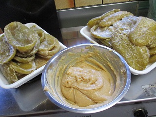 夢の手作り市 朝から良いお天気だったけど 今日は、とっても忙しかった(´Д`) 店頭に並んだ商品、お昼までに 漬物、ベリーシロップ漬け、かぼちゃ等 大繁盛でした ぼっちゃんカボチャの 簡単で美味しい食べ方のお話に 皆さん、食いつきました ”簡単で美味しそう〜”って あっ!と言う間に売れちゃいました(・´з`・) 売れなかったら家で食べる予定が 思わぬ展開で 商売って面白いなぁ〜と思います ついでにドライトマトのお話も 簡単キャベツのドライトマト和え (瓶の中身・・ドライトマト、ドライバジル チーズ、蜂蜜、オリーブオイル) 参考レシピ(二人分) ☆キャベツ(4枚位) ☆トマトのオイル漬け (オイルも使います) ☆バジルソルト(塩でも可)極少 ☆麻の実(ごまでも可) (有ればバジル) 作り方 1:キャベツは茹でずに蒸す(注) (水に浸けず、ザルで冷やす) 2:細く千切りにして軽く絞る 3:ドライトマトを小さく刻む 4:ドライバジル、チーズ、オイルをいれる 5:バジルソルトと麻の実(バジルも)で 味を調える (甘いのがお好きな方は蜂蜜をスプーン1) 先日、お客さんから頂いた「麻の実」 便秘に良いとお聞きしました スプーン1ぱいを毎日食べると体に良い! 安くて、美味しくて満足する食事 我が家の料理は 質素ですが、幸せな気分になります(^ω^) 2018年9月15日