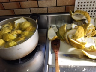 昨日の騒ぎも無かったように 朝から元気な夫 検査結果に異常は無しと連絡有り ホッとする(^ω^) 本日、アイスクリームのカップが 「ラッキーバーガー」さんのお世話で 津の「ミルクパレット」さんに 貰って頂きました アイスは長い間、続けてきた仕事の一つ カップを手放して、荷が軽くなった(゚Д゚) 少し、縮小して仕事を続けていくのが この先、安泰なのかも知れないと思う 玉城アグリから 「鬼ゆずが入荷しました!」の連絡 少しでも冷凍庫を空ける為 最後の鬼ゆずをジャムにするのと 橙ピールを仕上る ジャムもピールも下処理に時間がかかる 鬼ゆずが届いたら激務 毎年の事とは言え 大変な仕事だなぁ〜 2020年11月23日