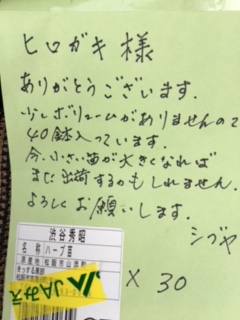 昨日、注文したバジルの苗を取りに 東黒部「きっする」 何時ものように1番のりで 無花果を全部買い占めた 横に居たおじ様が 「一つ分けてくれへんやろか?」と 箱に並べた無花果を 恨めしそうに見る(゚Д゚) 私は 「えぇ〜! 商売で要るんやけど」 おじ様は悲しそうな顔をする 私は 「小さいパック1個でもええですか?」 おじ様は 嬉しそうに1個を受け取るとレジに走る 正直、全部買い占めて悪かったと思う 雨続きで商品が少数 そんなに食べたかったのなら 真っ先に走らないと買えませんよ! 注文したバジルの苗を貰って車に乗せる 今日の収獲 レジで急いでたので気が付かなかった 生産者の方から伝言 30本をお願いしたのに 40本に増えてました〜(驚) 何本でも購入する予定だったので 嬉かったです! 助かりました! ありがとうございました(^ω^) 2021年8月20日