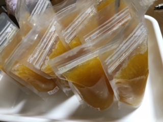 八朔の皮取り器、友人に借りた道具で 助かりました 袋を外した果肉は大きめに残して 使い勝手の良いように 仕分けして保存をする ゼリーや、パートドフリュイに 挑戦できたらと思う 失敗するかも知れないけど・・ (゚Д゚) 袋から出すのが大変なので 残りは発酵ジュースを作る 八朔の果肉:1キロ 甜菜糖 :500g 果実用ブランデー:50cc (正式な分量グラニュー糖1キロ) 甘すぎて、怖いので砂糖を半分にする その結果で、失敗するかも知れない! 果物の甘さが少なく、苦味が残るので 発酵が済んだら砂糖追加でも 美味しく出来るかも知れません 結果はまた、報告します。