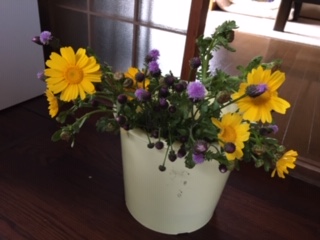 友達が草刈のバイトの下見にきたので 車に除草剤の容器を積んで畑まで 自分で散布をする予定だったけど 彼女の旦那さまにお願いをする 畑を一回りしてびっくした!! 一面に黄色の花 花を植えた覚えが無い! 翌々考えたら、ここは春菊を植えた列 足を骨折して収穫をしなかったので 花が咲いてしまった 春菊の花を始めて見る ( ゚д゚ ) 友人と二人 ”綺麗やなぁ〜家に欲しい!” 玄関に 活ける事にしました 折角なので 畑の花は刈らずに暫く眺める事にした 透き通った黄色と野あざみの薄紫 気持ちがとっても明るくなる( ゚д゚ ) 友人のおかげで草の心配が無くなった 持つべき友は頼りになる 産直のマスク 売れるのが早すぎて間に合いません 今日もこれから夜なべです(T・T) 2020年4月22日