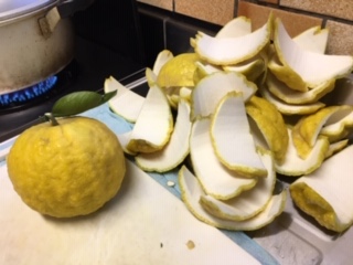 今年の8月からず〜っと気になってた 「梨のお中元」 頂いてから3ヶ月 夫の友人だった事が今日、わかった( ゚д゚ ) 何年ぶりかで寄って頂いて 夫が認知症って知って 気になって、今日も寄って頂いた! 「良く働いたもんなぁ〜、寂しいわ」 男友達って良いな 何の利害関係も無く、生涯友達で・・ 「また、寄るわ」と言い 熊野のみかんを届けていただいた。 (^ω^) 昨日、夜中に肩甲骨が痛くて 夜中にシップをする 鬼ゆずの下処理で包丁を持ったのが 堪えたようです 朝から続き、作業! 今年の初物 早速、明日は納品です。 2019年11月26日