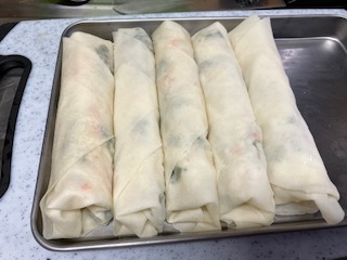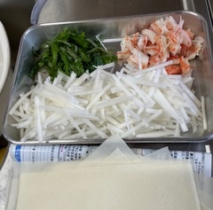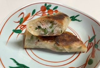 朝からおかきを商人館に納品 帰り道、畑に寄って大根1本を収穫 むちゃ大きくて どう考えても1人じゃ食べきれない! そこで、大根を多く消費する料理 「大根餅とカニカマ、大葉」の春巻き ![]() A;大根;半分(細切り) A;カニカマ;1袋 A;大葉;1袋 A;鶏がら粉末;大2 A;片栗粉;大2 春巻きの皮;6枚(残りは豚汁に使う) サラダ油、ごま油;少々 Aをあわせて皮で巻くだけの簡単で ヘルシーな料理です ![]() まず1本を焼いてみる フライパンに油を入れて弱火で蓋をして 両面を焼き、最後にゴマ油 簡単に言えば 水なしの餃子を焼く要領です ![]() もっちもっちで、大葉の香りが合う ポン酢で食べると美味しい! ![]() 残り半分の大根はおでんに・・・ 頑張って食べなあかんけど 2食分以上は有りそうだ ゆず味噌で 味変をすれば何回でも食べられる 2025年2月19日